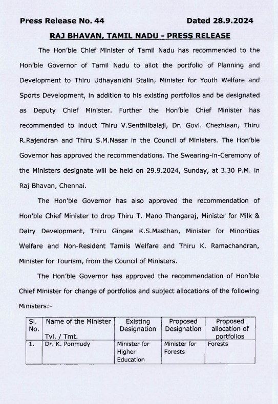 तमिलनाडु राजभवन द्वारा जारी दस्तावेज के अनुसार तमिलनाडु के मुख्यमंत्री एमके स्टालिन ने वी. सेंथिलबालाजी, डॉ. गोवी चेझियान, आर राजेंद्रन और एसएम नासर को मंत्रिपरिषद में शामिल करने की सिफारिश की। इसके बाद राज्यपाल ने सिफारिशों को मंजूरी दे दी। मनोनीत मंत्रियों का शपथ ग्रहण समारोह 29 सितंबर को दोपहर 3.30 बजे राजभवन, चेन्नई में होगा। एम के स्टालिन के बेटे स्टालिन डिप्टी सीएम होंगे।